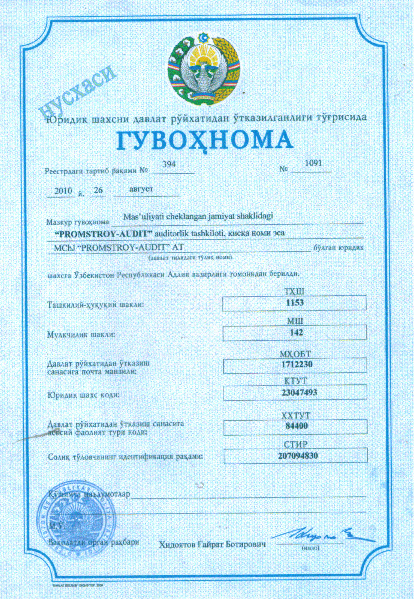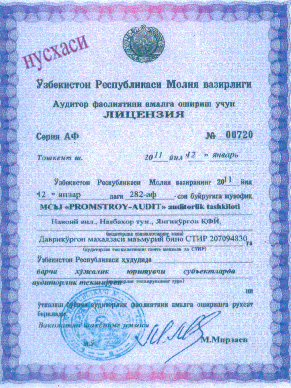 «PROMSTROY-AUDIT» MChJ auditorlik tashkiloti ustav kapitalidagi davlat aksiyalar paketi 50% dan yuqori bo'lgan korxonalarda tashqi auditorlik tekshiruvini o'tkazishi mumkin bo'lgan tashkilotlar ro'yxatiga kiritilgan.