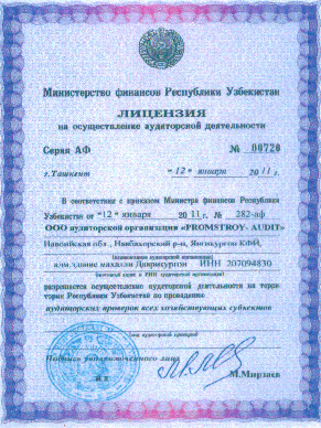 «PROMSTROY-AUDIT» MChJ auditorlik tashkiloti O'zbekiston Respublikasi Moliya vazirligi litsenziyasi asosida Milliy auditorlik standartlari va Buxgalterlar xalqaro federatsiyasi Xalqaro audit amaliyoti qo'mitasi tomonidan ishlab chiqilgan Xalqaro audit standartlariga muvofiq barcha tadbirkorlik sub'ektlarini auditorlik tekshiruvdan o'tkazadi.